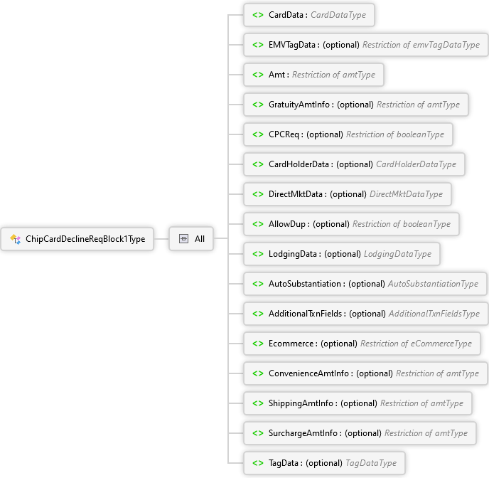 TagData Element SurchargeAmtInfo Element ShippingAmtInfo Element ConvenienceAmtInfo Element Ecommerce Element AdditionalTxnFields Element AutoSubstantiation Element LodgingData Element AllowDup Element DirectMktData Element CardHolderData Element CPCReq Element GratuityAmtInfo Element Amt Element EMVTagData Element CardData Element All ChipCardDeclineReqBlock1Type Complex Type