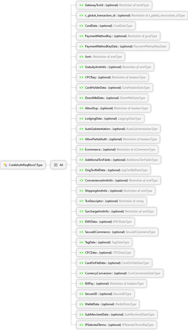 IPSelectedTerms Element SubMerchantData Element WalletData Element Secure3D Element BillPay Element CurrencyConversion Element CardOnFileData Element CPCData Element TagData Element SecureECommerce Element EMVData Element SurchargeAmtInfo Element TxnDescriptor Element ShippingAmtInfo Element ConvenienceAmtInfo Element OrigTxnRefData Element AdditionalTxnFields Element Ecommerce Element AllowPartialAuth Element AutoSubstantiation Element LodgingData Element AllowDup Element DirectMktData Element CardHolderData Element CPCReq Element GratuityAmtInfo Element Amt Element PaymentMethodKeyData Element PaymentMethodKey Element CardData Element x_global_transaction_id Element GatewayTxnId Element All CreditAuthReqBlock1Type Complex Type