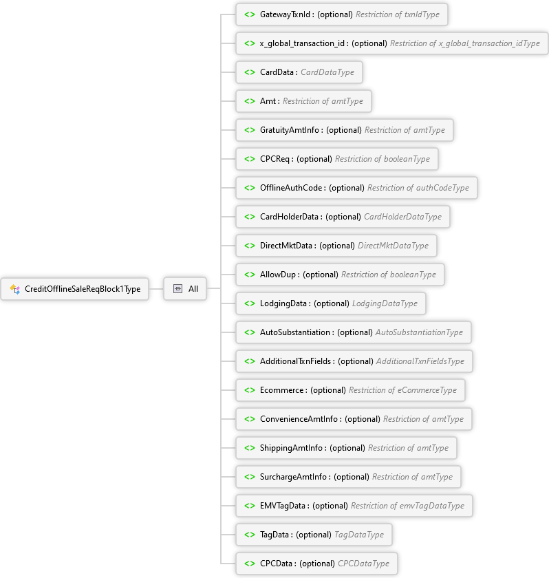 CPCData Element TagData Element EMVTagData Element SurchargeAmtInfo Element ShippingAmtInfo Element ConvenienceAmtInfo Element Ecommerce Element AdditionalTxnFields Element AutoSubstantiation Element LodgingData Element AllowDup Element DirectMktData Element CardHolderData Element OfflineAuthCode Element CPCReq Element GratuityAmtInfo Element Amt Element CardData Element x_global_transaction_id Element GatewayTxnId Element All CreditOfflineSaleReqBlock1Type Complex Type