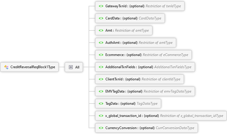 CurrencyConversion Element x_global_transaction_id Element TagData Element EMVTagData Element ClientTxnId Element AdditionalTxnFields Element Ecommerce Element AuthAmt Element Amt Element CardData Element GatewayTxnId Element All CreditReversalReqBlock1Type Complex Type