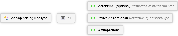 <xs:complexTypename="ManageSettingsReqType"xmlns:xs="http://www.w3.org/2001/XMLSchema"><xs:all><xs:elementname="MerchNbr"type="merchNbrType"minOccurs="0"><xs:annotation><xs:documentation><pxmlns="http://Hps.Exchange.PosGateway">The merchant number</p></xs:documentation></xs:annotation></xs:element><xs:elementname="DeviceId"type="deviceIdType"minOccurs="0"><xs:annotation><xs:documentation><pxmlns="http://Hps.Exchange.PosGateway">Used to specify the device id for which settings should be managed (must belong to the merchant)</p></xs:documentation></xs:annotation></xs:element><xs:elementname="SettingActions"><xs:annotation><xs:documentation><pxmlns="http://Hps.Exchange.PosGateway">The operations that can be performed on the associated settings</p></xs:documentation></xs:annotation><xs:complexType><xs:choice><xs:elementname="Set"><xs:complexType><xs:sequencemaxOccurs="100"><xs:elementname="NameValuePair"type="NameValuePairType"><xs:annotation><xs:documentation><pxmlns="http://Hps.Exchange.PosGateway">The name and value of the setting to update</p></xs:documentation></xs:annotation></xs:element></xs:sequence></xs:complexType></xs:element><xs:elementname="Query"><xs:complexType><xs:sequenceminOccurs="0"maxOccurs="100"><xs:elementname="Name"type="xs:string"><xs:annotation><xs:documentation><pxmlns="http://Hps.Exchange.PosGateway">The name of the setting to query</p></xs:documentation></xs:annotation></xs:element></xs:sequence></xs:complexType></xs:element></xs:choice></xs:complexType></xs:element></xs:all></xs:complexType>