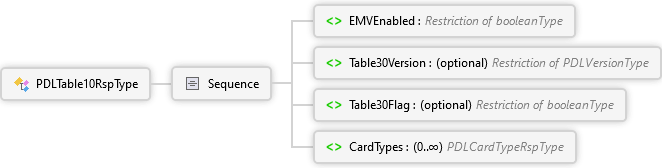 <xs:complexTypename="PDLTable10RspType"xmlns:xs="http://www.w3.org/2001/XMLSchema"><xs:sequence><xs:elementname="EMVEnabled"type="booleanType"><xs:annotation><xs:documentation><pxmlns="http://Hps.Exchange.PosGateway">Indicates whether EMV is enabled for the POS</p></xs:documentation></xs:annotation></xs:element><xs:elementname="Table30Version"type="PDLVersionType"minOccurs="0"><xs:annotation><xs:documentation><pxmlns="http://Hps.Exchange.PosGateway">Indicates the current version of Table-ID 30 available to the POS</p></xs:documentation></xs:annotation></xs:element><xs:elementname="Table30Flag"type="booleanType"minOccurs="0"><xs:annotation><xs:documentation><pxmlns="http://Hps.Exchange.PosGateway">Indicates if a Table-ID 30 download is required</p></xs:documentation></xs:annotation></xs:element><xs:elementname="CardTypes"type="PDLCardTypeRspType"minOccurs="0"maxOccurs="unbounded"><xs:annotation><xs:documentation><pxmlns="http://Hps.Exchange.PosGateway">Card type data</p></xs:documentation></xs:annotation></xs:element></xs:sequence></xs:complexType>