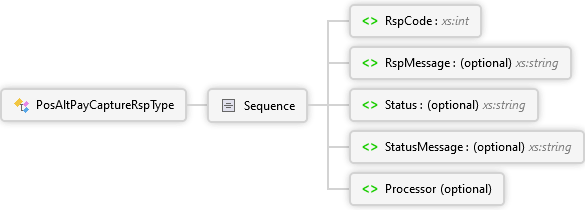 <xs:complexTypename="PosAltPayCaptureRspType"xmlns:xs="http://www.w3.org/2001/XMLSchema"><xs:sequence><xs:elementname="RspCode"type="xs:int"><xs:annotation><xs:documentation><pxmlns="http://Hps.Exchange.PosGateway">Response (result) code indicating the overall success of the transaction; '0' indicates success while non-zero indicates a failure.</p></xs:documentation></xs:annotation></xs:element><xs:elementname="RspMessage"type="xs:string"minOccurs="0"><xs:annotation><xs:documentation><pxmlns="http://Hps.Exchange.PosGateway">Response message returned by the processor</p></xs:documentation></xs:annotation></xs:element><xs:elementname="Status"type="xs:string"minOccurs="0"><xs:annotation><xs:documentation><pxmlns="http://Hps.Exchange.PosGateway">Status from processors processing of the transaction</p></xs:documentation></xs:annotation></xs:element><xs:elementname="StatusMessage"type="xs:string"minOccurs="0"><xs:annotation><xs:documentation><pxmlns="http://Hps.Exchange.PosGateway">Status message from processors processing of the transaction</p></xs:documentation></xs:annotation></xs:element><xs:elementname="Processor"minOccurs="0"><xs:annotation><xs:documentation><pxmlns="http://Hps.Exchange.PosGateway">Additional processor response information</p></xs:documentation></xs:annotation><xs:complexType><xs:sequencemaxOccurs="100"><xs:elementname="Response"type="NameValuePairCollectionType"><xs:annotation><xs:documentation>Response Information</xs:documentation></xs:annotation></xs:element></xs:sequence></xs:complexType></xs:element></xs:sequence></xs:complexType>