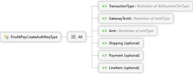 <xs:complexTypename="PosAltPayCreateAuthReqType"xmlns:xs="http://www.w3.org/2001/XMLSchema"><xs:all><xs:elementname="TransactionType"type="AltPaymentTxnType"><xs:annotation><xs:documentation><pxmlns="http://Hps.Exchange.PosGateway">Alternate Payment Transaction Type</p></xs:documentation></xs:annotation></xs:element><xs:elementname="GatewayTxnId"type="txnIdType"><xs:annotation><xs:documentation><pxmlns="http://Hps.Exchange.PosGateway">Gateway generated transaction identifier returned in the response of the original transaction. This indicates the original Alt Payment transaction to create an authorization against.</p></xs:documentation></xs:annotation></xs:element><xs:elementname="Amt"type="amtType"><xs:annotation><xs:documentation><pxmlns="http://Hps.Exchange.PosGateway">Amount for the new authorization</p></xs:documentation></xs:annotation></xs:element><xs:elementname="Shipping"minOccurs="0"><xs:annotation><xs:documentation><pxmlns="http://Hps.Exchange.PosGateway">Shipping Information for the new authorization</p></xs:documentation></xs:annotation><xs:complexType><xs:sequencemaxOccurs="10"><xs:elementname="Address"type="NameValuePairCollectionType"><xs:annotation><xs:documentation>Address Information</xs:documentation></xs:annotation></xs:element></xs:sequence></xs:complexType></xs:element><xs:elementname="Payment"minOccurs="0"><xs:annotation><xs:documentation><pxmlns="http://Hps.Exchange.PosGateway">Payment Information for the new authorization</p></xs:documentation></xs:annotation><xs:complexType><xs:sequencemaxOccurs="200"><xs:elementname="NameValuePair"type="NameValuePairType"/></xs:sequence></xs:complexType></xs:element><xs:elementname="LineItem"minOccurs="0"><xs:annotation><xs:documentation><pxmlns="http://Hps.Exchange.PosGateway">Line Item purchase information for the new authorization</p></xs:documentation></xs:annotation><xs:complexType><xs:sequencemaxOccurs="100"><xs:elementname="Detail"type="NameValuePairCollectionType"><xs:annotation><xs:documentation>Detail Information</xs:documentation></xs:annotation></xs:element></xs:sequence></xs:complexType></xs:element></xs:all></xs:complexType>