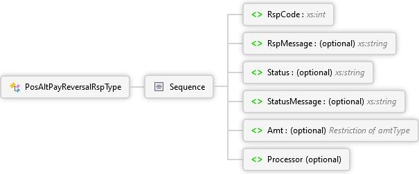 <xs:complexTypename="PosAltPayReversalRspType"xmlns:xs="http://www.w3.org/2001/XMLSchema"><xs:sequence><xs:elementname="RspCode"type="xs:int"><xs:annotation><xs:documentation><pxmlns="http://Hps.Exchange.PosGateway">Response (result) code indicating the overall success of the transaction; '0' indicates success while non-zero indicates a failure.</p></xs:documentation></xs:annotation></xs:element><xs:elementname="RspMessage"type="xs:string"minOccurs="0"><xs:annotation><xs:documentation><pxmlns="http://Hps.Exchange.PosGateway">Response message returned by the processor</p></xs:documentation></xs:annotation></xs:element><xs:elementname="Status"type="xs:string"minOccurs="0"><xs:annotation><xs:documentation><pxmlns="http://Hps.Exchange.PosGateway">Status from processors processing of the transaction</p></xs:documentation></xs:annotation></xs:element><xs:elementname="StatusMessage"type="xs:string"minOccurs="0"><xs:annotation><xs:documentation><pxmlns="http://Hps.Exchange.PosGateway">Status message from processors processing of the transaction</p></xs:documentation></xs:annotation></xs:element><xs:elementname="Amt"type="amtType"minOccurs="0"><xs:annotation><xs:documentation><pxmlns="http://Hps.Exchange.PosGateway">Reversal Amount</p></xs:documentation></xs:annotation></xs:element><xs:elementname="Processor"minOccurs="0"><xs:annotation><xs:documentation><pxmlns="http://Hps.Exchange.PosGateway">Additional processor response information</p></xs:documentation></xs:annotation><xs:complexType><xs:sequencemaxOccurs="100"><xs:elementname="Response"type="NameValuePairCollectionType"><xs:annotation><xs:documentation>Response Information</xs:documentation></xs:annotation></xs:element></xs:sequence></xs:complexType></xs:element></xs:sequence></xs:complexType>