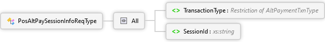 <xs:complexType name="PosAltPaySessionInfoReqType" xmlns:xs="http://www.w3.org/2001/XMLSchema"> <xs:all> <xs:element name="TransactionType" type="AltPaymentTxnType"> <xs:annotation> <xs:documentation> <p xmlns="http://Hps.Exchange.PosGateway">Alternate Payment Transaction Type</p> </xs:documentation> </xs:annotation> </xs:element> <xs:element name="SessionId" type="xs:string"> <xs:annotation> <xs:documentation> <p xmlns="http://Hps.Exchange.PosGateway">Unique Session Id</p> </xs:documentation> </xs:annotation> </xs:element> </xs:all> </xs:complexType>