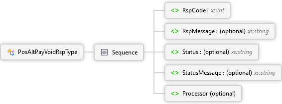 <xs:complexTypename="PosAltPayVoidRspType"xmlns:xs="http://www.w3.org/2001/XMLSchema"><xs:sequence><xs:elementname="RspCode"type="xs:int"><xs:annotation><xs:documentation><pxmlns="http://Hps.Exchange.PosGateway">Response (result) code indicating the overall success of the transaction; '0' indicates success while non-zero indicates a failure.</p></xs:documentation></xs:annotation></xs:element><xs:elementname="RspMessage"type="xs:string"minOccurs="0"><xs:annotation><xs:documentation><pxmlns="http://Hps.Exchange.PosGateway">Response message returned by the processor</p></xs:documentation></xs:annotation></xs:element><xs:elementname="Status"type="xs:string"minOccurs="0"><xs:annotation><xs:documentation><pxmlns="http://Hps.Exchange.PosGateway">Status from processors processing of the transaction</p></xs:documentation></xs:annotation></xs:element><xs:elementname="StatusMessage"type="xs:string"minOccurs="0"><xs:annotation><xs:documentation><pxmlns="http://Hps.Exchange.PosGateway">Status message from processors processing of the transaction</p></xs:documentation></xs:annotation></xs:element><xs:elementname="Processor"minOccurs="0"><xs:annotation><xs:documentation><pxmlns="http://Hps.Exchange.PosGateway">Additional processor response information</p></xs:documentation></xs:annotation><xs:complexType><xs:sequencemaxOccurs="100"><xs:elementname="Response"type="NameValuePairCollectionType"><xs:annotation><xs:documentation>Response Information</xs:documentation></xs:annotation></xs:element></xs:sequence></xs:complexType></xs:element></xs:sequence></xs:complexType>