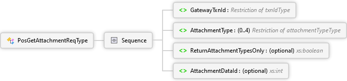 <xs:complexTypename="PosGetAttachmentReqType"xmlns:xs="http://www.w3.org/2001/XMLSchema"><xs:sequence><xs:elementname="GatewayTxnId"type="txnIdType"><xs:annotation><xs:documentation><pxmlns="http://Hps.Exchange.PosGateway">Gateway-generated transaction identifier returned in the response of the original transaction.</p></xs:documentation></xs:annotation></xs:element><xs:elementname="AttachmentType"type="attachmentTypeType"minOccurs="0"maxOccurs="4"><xs:annotation><xs:documentation><pxmlns="http://Hps.Exchange.PosGateway">Identifies the attachment types to be returned; see the associated Type enumerations for specific values supported.</p><pxmlns="http://Hps.Exchange.PosGateway"/><pxmlns="http://Hps.Exchange.PosGateway"><strong>Note:</strong> If this is not provided, 'all' is assumed.</p></xs:documentation></xs:annotation></xs:element><xs:elementname="ReturnAttachmentTypesOnly"type="xs:boolean"minOccurs="0"><xs:annotation><xs:documentation><pxmlns="http://Hps.Exchange.PosGateway">Indicates that only the attachment types (no data) should be returned in the response; default is 'false'</p></xs:documentation></xs:annotation></xs:element><xs:elementname="AttachmentDataId"type="xs:int"minOccurs="0"><xs:annotation><xs:documentation><pxmlns="http://Hps.Exchange.PosGateway">When specified, only the requested attachment will be returned</p></xs:documentation></xs:annotation></xs:element></xs:sequence></xs:complexType>
