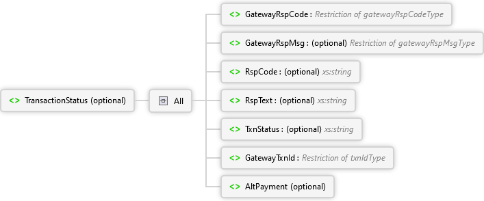 <xs:elementname="TransactionStatus"minOccurs="0"xmlns:xs="http://www.w3.org/2001/XMLSchema"><xs:complexType><xs:all><xs:elementname="GatewayRspCode"type="gatewayRspCodeType"/><xs:elementname="GatewayRspMsg"type="gatewayRspMsgType"minOccurs="0"/><xs:elementname="RspCode"type="xs:string"minOccurs="0"/><xs:elementname="RspText"type="xs:string"minOccurs="0"/><xs:elementname="TxnStatus"type="xs:string"minOccurs="0"/><xs:elementname="GatewayTxnId"type="txnIdType"/><xs:elementname="AltPayment"minOccurs="0"><xs:complexType><xs:all><xs:elementname="Status"type="xs:string"minOccurs="0"/><xs:elementname="StatusMessage"type="xs:string"minOccurs="0"/><xs:elementname="StatusDT"type="xs:dateTime"minOccurs="0"><xs:annotation><xs:documentation>Date and time the status was recorded.</xs:documentation></xs:annotation></xs:element></xs:all></xs:complexType></xs:element></xs:all></xs:complexType></xs:element>