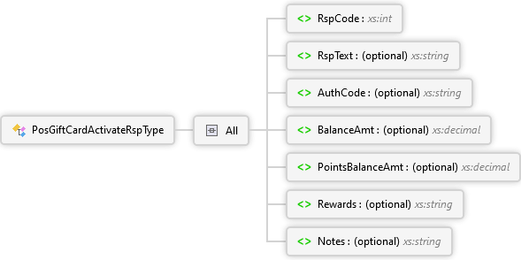 Notes Element Rewards Element PointsBalanceAmt Element BalanceAmt Element AuthCode Element RspText Element RspCode Element All PosGiftCardActivateRspType Complex Type