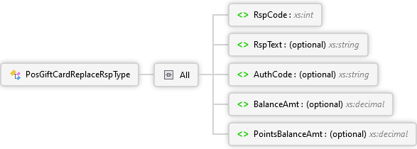 <xs:complexTypename="PosGiftCardReplaceRspType"xmlns:xs="http://www.w3.org/2001/XMLSchema"><xs:all><xs:elementname="RspCode"type="xs:int"><xs:annotation><xs:documentation><pxmlns="http://Hps.Exchange.PosGateway">Response (result) code returned by the issuer</p></xs:documentation></xs:annotation></xs:element><xs:elementname="RspText"type="xs:string"minOccurs="0"><xs:annotation><xs:documentation><pxmlns="http://Hps.Exchange.PosGateway">Response (result) text returned by the issuer</p></xs:documentation></xs:annotation></xs:element><xs:elementname="AuthCode"type="xs:string"minOccurs="0"><xs:annotation><xs:documentation><pxmlns="http://Hps.Exchange.PosGateway">If authorized, authorization code returned by the issuer</p></xs:documentation></xs:annotation></xs:element><xs:elementname="BalanceAmt"type="xs:decimal"minOccurs="0"><xs:annotation><xs:documentation><pxmlns="http://Hps.Exchange.PosGateway">Balance on the new account after the transaction</p></xs:documentation></xs:annotation></xs:element><xs:elementname="PointsBalanceAmt"type="xs:decimal"minOccurs="0"><xs:annotation><xs:documentation><pxmlns="http://Hps.Exchange.PosGateway">Points balance on the new account after the transaction</p></xs:documentation></xs:annotation></xs:element></xs:all></xs:complexType>