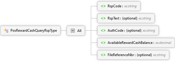 <xs:complexTypename="PosRewardCashQueryRspType"xmlns:xs="http://www.w3.org/2001/XMLSchema"><xs:all><xs:elementname="RspCode"type="xs:string"><xs:annotation><xs:documentation><pxmlns="http://Hps.Exchange.PosGateway">Response (result) code returned by the issuer</p></xs:documentation></xs:annotation></xs:element><xs:elementname="RspText"type="xs:string"minOccurs="0"><xs:annotation><xs:documentation><pxmlns="http://Hps.Exchange.PosGateway">Response (result) text returned by the issuer</p></xs:documentation></xs:annotation></xs:element><xs:elementname="AuthCode"type="xs:string"minOccurs="0"><xs:annotation><xs:documentation><pxmlns="http://Hps.Exchange.PosGateway">If authorized, authorization code returned by the issuer</p></xs:documentation></xs:annotation></xs:element><xs:elementname="AvailableRewardCashBalance"type="xs:decimal"><xs:annotation><xs:documentation><pxmlns="http://Hps.Exchange.PosGateway">Available Points balance on the cardholder account</p></xs:documentation></xs:annotation></xs:element><xs:elementname="FileReferenceNbr"type="xs:string"minOccurs="0"><xs:annotation><xs:documentation><pxmlns="http://Hps.Exchange.PosGateway">Reference number returned by the processor or issuer</p></xs:documentation></xs:annotation></xs:element></xs:all></xs:complexType>