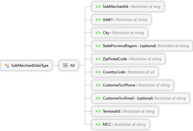 <xs:complexTypename="SubMerchantDataType"xmlns:xs="http://www.w3.org/2001/XMLSchema"><xs:all><xs:elementname="SubMerchantId"><xs:annotation><xs:documentation><pxmlns="http://Hps.Exchange.PosGateway">The ID assigned by the payment facilitator or aggregator to the sub-merchant.</p><pxmlns="http://Hps.Exchange.PosGateway"><strong>Note:</strong> For internal use only.</p></xs:documentation></xs:annotation><xs:simpleType><xs:restrictionbase="xs:long"><xs:fractionDigitsvalue="0"/><xs:minInclusivevalue="1"/><xs:maxInclusivevalue="999999999999999"/></xs:restriction></xs:simpleType></xs:element><xs:elementname="Addr1"><xs:annotation><xs:documentation><pxmlns="http://Hps.Exchange.PosGateway">The street address of the sub-merchant.</p><pxmlns="http://Hps.Exchange.PosGateway"><strong>Note:</strong> For internal use only.</p></xs:documentation></xs:annotation><xs:simpleType><xs:restrictionbase="xs:string"><xs:maxLengthvalue="32"/><xs:patternvalue="^[a-zA-Z\d\s]+$"/></xs:restriction></xs:simpleType></xs:element><xs:elementname="City"><xs:annotation><xs:documentation><pxmlns="http://Hps.Exchange.PosGateway">The city of the sub-merchant.</p><pxmlns="http://Hps.Exchange.PosGateway"><strong>Note:</strong> For internal use only.</p></xs:documentation></xs:annotation><xs:simpleType><xs:restrictionbase="xs:string"><xs:maxLengthvalue="13"/></xs:restriction></xs:simpleType></xs:element><xs:elementname="StateProvinceRegion"minOccurs="0"><xs:annotation><xs:documentation><pxmlns="http://Hps.Exchange.PosGateway">The state or province of the sub-merchant.</p><pxmlns="http://Hps.Exchange.PosGateway"><strong>Note:</strong> For internal use only.</p></xs:documentation></xs:annotation><xs:simpleType><xs:restrictionbase="xs:string"><xs:maxLengthvalue="3"/><xs:patternvalue="^[a-zA-Z\d]+$"/></xs:restriction></xs:simpleType></xs:element><xs:elementname="ZipPostalCode"><xs:annotation><xs:documentation><pxmlns="http://Hps.Exchange.PosGateway">The ZIP/Postal Code of the sub-merchant.</p><pxmlns="http://Hps.Exchange.PosGateway"><strong>Note:</strong> For internal use only.</p></xs:documentation></xs:annotation><xs:simpleType><xs:restrictionbase="xs:string"><xs:maxLengthvalue="10"/></xs:restriction></xs:simpleType></xs:element><xs:elementname="CountryCode"><xs:annotation><xs:documentation><pxmlns="http://Hps.Exchange.PosGateway">The 3-digit ISO Numeric Country Code of the sub-merchant (eg, 840)</p><pxmlns="http://Hps.Exchange.PosGateway"><strong>Note:</strong> For internal use only.</p></xs:documentation></xs:annotation><xs:simpleType><xs:restrictionbase="xs:int"><xs:minInclusivevalue="1"/><xs:maxInclusivevalue="999"/></xs:restriction></xs:simpleType></xs:element><xs:elementname="CustomerSvcPhone"><xs:annotation><xs:documentation><pxmlns="http://Hps.Exchange.PosGateway">Sub-merchant phone number.</p><pxmlns="http://Hps.Exchange.PosGateway"><strong>Note:</strong> For internal use only.</p></xs:documentation></xs:annotation><xs:simpleType><xs:restrictionbase="xs:string"><xs:maxLengthvalue="16"/><xs:patternvalue="[0-9]{10,16}"/></xs:restriction></xs:simpleType></xs:element><xs:elementname="CustomerSvcEmail"minOccurs="0"><xs:annotation><xs:documentation><pxmlns="http://Hps.Exchange.PosGateway">Sub-merchant email address.</p><pxmlns="http://Hps.Exchange.PosGateway"><strong>Note:</strong> For internal use only.</p></xs:documentation></xs:annotation><xs:simpleType><xs:restrictionbase="xs:string"><xs:maxLengthvalue="40"/></xs:restriction></xs:simpleType></xs:element><xs:elementname="TerminalId"><xs:annotation><xs:documentation><pxmlns="http://Hps.Exchange.PosGateway">The sub-merchant Terminal ID assigned by the payment facilitator.</p><pxmlns="http://Hps.Exchange.PosGateway"><strong>Note:</strong> For internal use only.</p></xs:documentation></xs:annotation><xs:simpleType><xs:restrictionbase="xs:string"><xs:maxLengthvalue="8"/></xs:restriction></xs:simpleType></xs:element><xs:elementname="MCC"><xs:annotation><xs:documentation><pxmlns="http://Hps.Exchange.PosGateway">Sub-merchant MCC.</p><pxmlns="http://Hps.Exchange.PosGateway"><strong>Note:</strong> For internal use only.</p></xs:documentation></xs:annotation><xs:simpleType><xs:restrictionbase="xs:string"><xs:maxLengthvalue="4"/><xs:patternvalue="[0-9]{4}"/></xs:restriction></xs:simpleType></xs:element></xs:all></xs:complexType>