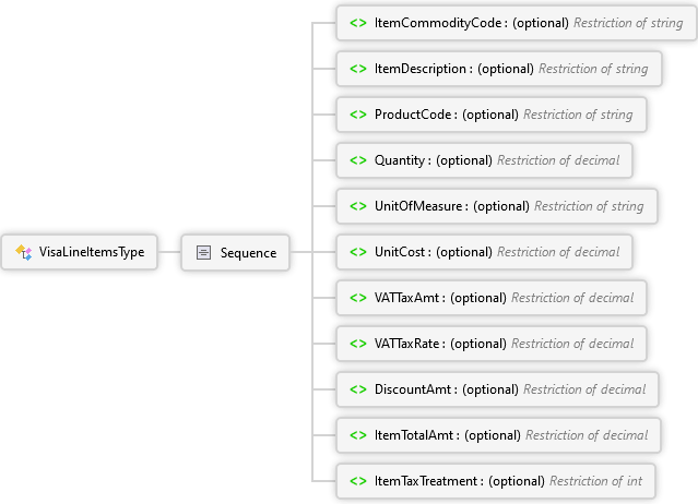 <xs:complexTypename="VisaLineItemsType"xmlns:xs="http://www.w3.org/2001/XMLSchema"><xs:sequence><xs:elementname="ItemCommodityCode"minOccurs="0"><xs:annotation><xs:documentation><pxmlns="http://Hps.Exchange.PosGateway">The national standard description code of the good or service being supplied.</p></xs:documentation></xs:annotation><xs:simpleType><xs:restrictionbase="xs:string"><xs:patternvalue="^[a-zA-Z0-9]*$"/><xs:maxLengthvalue="12"/></xs:restriction></xs:simpleType></xs:element><xs:elementname="ItemDescription"minOccurs="0"><xs:annotation><xs:documentation><pxmlns="http://Hps.Exchange.PosGateway">Description of the good or service being supplied.</p></xs:documentation></xs:annotation><xs:simpleType><xs:restrictionbase="xs:string"><xs:patternvalue="^[a-zA-Z0-9 ]*$"/><xs:maxLengthvalue="26"/></xs:restriction></xs:simpleType></xs:element><xs:elementname="ProductCode"minOccurs="0"><xs:annotation><xs:documentation><pxmlns="http://Hps.Exchange.PosGateway">Identifies the product being purchased, for example, an inventory number or UPC code. A value other than spaces or zeros should be provided.</p></xs:documentation></xs:annotation><xs:simpleType><xs:restrictionbase="xs:string"><xs:patternvalue="^[a-zA-Z0-9]*$"/><xs:maxLengthvalue="12"/></xs:restriction></xs:simpleType></xs:element><xs:elementname="Quantity"minOccurs="0"><xs:annotation><xs:documentation><pxmlns="http://Hps.Exchange.PosGateway">The number of units of the product being purchased. Must be numeric and greater than zero.</p></xs:documentation></xs:annotation><xs:simpleType><xs:restrictionbase="xs:decimal"><xs:totalDigitsvalue="12"/><xs:fractionDigitsvalue="4"/><xs:minExclusivevalue="0"/><xs:maxExclusivevalue="100000000"/></xs:restriction></xs:simpleType></xs:element><xs:elementname="UnitOfMeasure"minOccurs="0"><xs:annotation><xs:documentation><pxmlns="http://Hps.Exchange.PosGateway">Contains the code indicating the unit of measure (gallons, etc.).</p></xs:documentation></xs:annotation><xs:simpleType><xs:restrictionbase="xs:string"><xs:patternvalue="^[a-zA-Z0-9]*$"/><xs:maxLengthvalue="12"/></xs:restriction></xs:simpleType></xs:element><xs:elementname="UnitCost"minOccurs="0"><xs:annotation><xs:documentation><pxmlns="http://Hps.Exchange.PosGateway">The cost per unit of measure.</p></xs:documentation></xs:annotation><xs:simpleType><xs:restrictionbase="xs:decimal"><xs:fractionDigitsvalue="4"/><xs:totalDigitsvalue="12"/><xs:minInclusivevalue="0"/><xs:maxExclusivevalue="100000000"/></xs:restriction></xs:simpleType></xs:element><xs:elementname="VATTaxAmt"minOccurs="0"><xs:annotation><xs:documentation><pxmlns="http://Hps.Exchange.PosGateway">Contains any Value Added Tax Amount or Other Sales Tax Amount.</p><pxmlns="http://Hps.Exchange.PosGateway"><strong>Note:</strong> Not applicable for US merchants.</p></xs:documentation></xs:annotation><xs:simpleType><xs:restrictionbase="xs:decimal"><xs:totalDigitsvalue="12"/><xs:fractionDigitsvalue="2"/><xs:maxExclusivevalue="10000000000"/><xs:minInclusivevalue="0"/></xs:restriction></xs:simpleType></xs:element><xs:elementname="VATTaxRate"minOccurs="0"><xs:annotation><xs:documentation><pxmlns="http://Hps.Exchange.PosGateway">The tax rate (percentage) of the Value Added Tax or Other Sales Tax.</p><pxmlns="http://Hps.Exchange.PosGateway"><strong>Note:</strong> Not applicable for US merchants.</p></xs:documentation></xs:annotation><xs:simpleType><xs:restrictionbase="xs:decimal"><xs:totalDigitsvalue="4"/><xs:fractionDigitsvalue="2"/><xs:maxExclusivevalue="100"/><xs:minInclusivevalue="0"/></xs:restriction></xs:simpleType></xs:element><xs:elementname="DiscountAmt"minOccurs="0"><xs:annotation><xs:documentation><pxmlns="http://Hps.Exchange.PosGateway">Contains any discount on this line item.</p></xs:documentation></xs:annotation><xs:simpleType><xs:restrictionbase="xs:decimal"><xs:totalDigitsvalue="12"/><xs:fractionDigitsvalue="2"/><xs:minInclusivevalue="0"/><xs:maxExclusivevalue="10000000000"/></xs:restriction></xs:simpleType></xs:element><xs:elementname="ItemTotalAmt"minOccurs="0"><xs:annotation><xs:documentation><pxmlns="http://Hps.Exchange.PosGateway">Contains the total amount of the line item; calculated as unit cost multiplied by quantity, less discount.</p></xs:documentation></xs:annotation><xs:simpleType><xs:restrictionbase="xs:decimal"><xs:fractionDigitsvalue="2"/><xs:totalDigitsvalue="12"/><xs:minInclusivevalue="0"/><xs:maxExclusivevalue="10000000000"/></xs:restriction></xs:simpleType></xs:element><xs:elementname="ItemTaxTreatment"minOccurs="0"><xs:annotation><xs:documentation><pxmlns="http://Hps.Exchange.PosGateway">0 No discount applied</p><pxmlns="http://Hps.Exchange.PosGateway">1 Tax was calculated before the discount was applied</p><pxmlns="http://Hps.Exchange.PosGateway">2 Tax was calculated after the discount was applied</p></xs:documentation></xs:annotation><xs:simpleType><xs:restrictionbase="xs:int"><xs:minInclusivevalue="0"/><xs:maxInclusivevalue="2"/></xs:restriction></xs:simpleType></xs:element></xs:sequence></xs:complexType>
