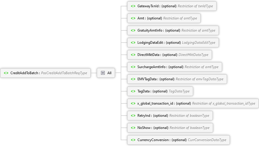 CurrencyConversion Element NoShow Element RetryInd Element x_global_transaction_id Element TagData Element EMVTagData Element SurchargeAmtInfo Element DirectMktData Element LodgingDataEdit Element GratuityAmtInfo Element Amt Element GatewayTxnId Element All CreditAddToBatch Element