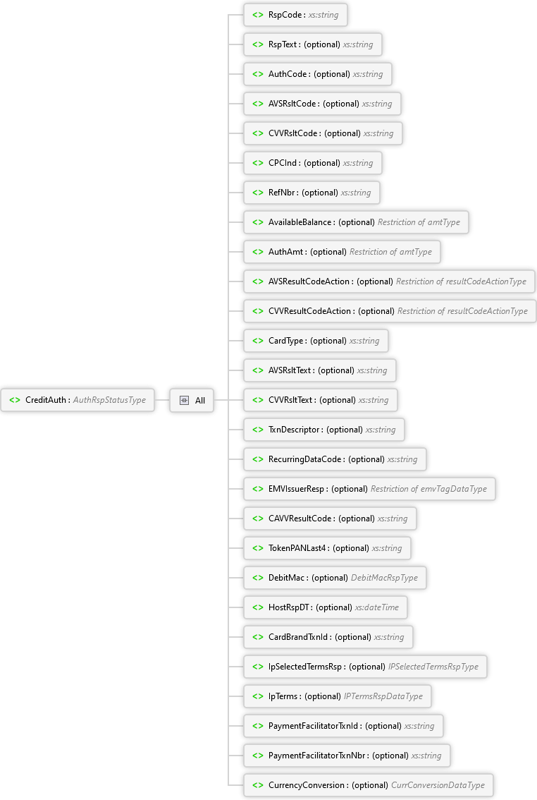 CurrencyConversion Element PaymentFacilitatorTxnNbr Element PaymentFacilitatorTxnId Element IpTerms Element IpSelectedTermsRsp Element CardBrandTxnId Element HostRspDT Element DebitMac Element TokenPANLast4 Element CAVVResultCode Element EMVIssuerResp Element RecurringDataCode Element TxnDescriptor Element CVVRsltText Element AVSRsltText Element CardType Element CVVResultCodeAction Element AVSResultCodeAction Element AuthAmt Element AvailableBalance Element RefNbr Element CPCInd Element CVVRsltCode Element AVSRsltCode Element AuthCode Element RspText Element RspCode Element All CreditAuth Element