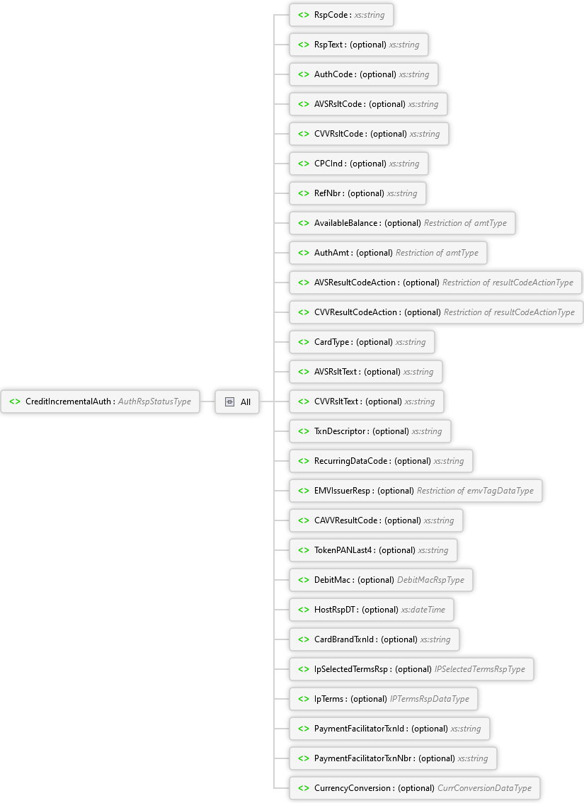 CurrencyConversion Element PaymentFacilitatorTxnNbr Element PaymentFacilitatorTxnId Element IpTerms Element IpSelectedTermsRsp Element CardBrandTxnId Element HostRspDT Element DebitMac Element TokenPANLast4 Element CAVVResultCode Element EMVIssuerResp Element RecurringDataCode Element TxnDescriptor Element CVVRsltText Element AVSRsltText Element CardType Element CVVResultCodeAction Element AVSResultCodeAction Element AuthAmt Element AvailableBalance Element RefNbr Element CPCInd Element CVVRsltCode Element AVSRsltCode Element AuthCode Element RspText Element RspCode Element All CreditIncrementalAuth Element