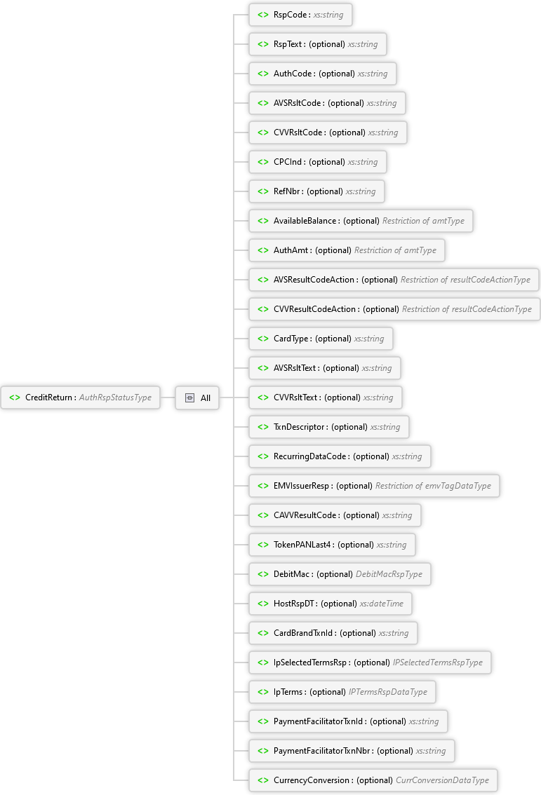 CurrencyConversion Element PaymentFacilitatorTxnNbr Element PaymentFacilitatorTxnId Element IpTerms Element IpSelectedTermsRsp Element CardBrandTxnId Element HostRspDT Element DebitMac Element TokenPANLast4 Element CAVVResultCode Element EMVIssuerResp Element RecurringDataCode Element TxnDescriptor Element CVVRsltText Element AVSRsltText Element CardType Element CVVResultCodeAction Element AVSResultCodeAction Element AuthAmt Element AvailableBalance Element RefNbr Element CPCInd Element CVVRsltCode Element AVSRsltCode Element AuthCode Element RspText Element RspCode Element All CreditReturn Element