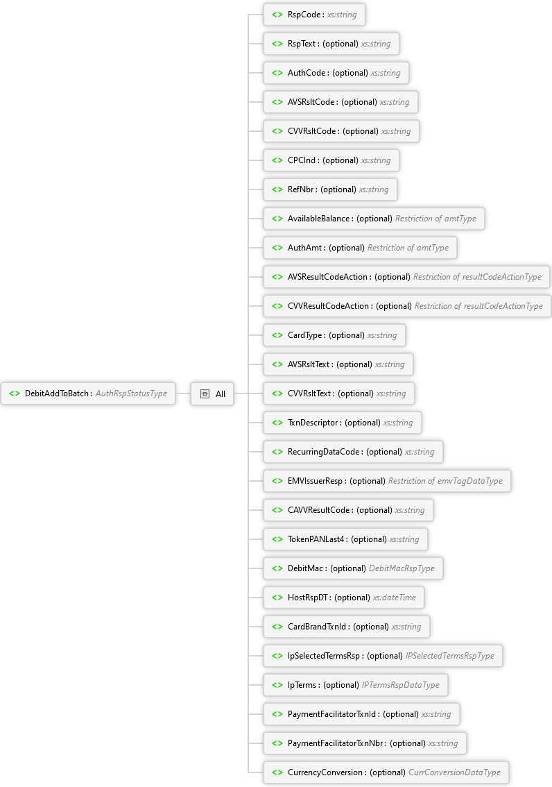 CurrencyConversion Element PaymentFacilitatorTxnNbr Element PaymentFacilitatorTxnId Element IpTerms Element IpSelectedTermsRsp Element CardBrandTxnId Element HostRspDT Element DebitMac Element TokenPANLast4 Element CAVVResultCode Element EMVIssuerResp Element RecurringDataCode Element TxnDescriptor Element CVVRsltText Element AVSRsltText Element CardType Element CVVResultCodeAction Element AVSResultCodeAction Element AuthAmt Element AvailableBalance Element RefNbr Element CPCInd Element CVVRsltCode Element AVSRsltCode Element AuthCode Element RspText Element RspCode Element All DebitAddToBatch Element
