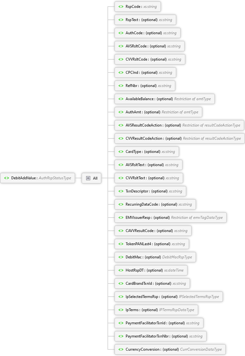 CurrencyConversion Element PaymentFacilitatorTxnNbr Element PaymentFacilitatorTxnId Element IpTerms Element IpSelectedTermsRsp Element CardBrandTxnId Element HostRspDT Element DebitMac Element TokenPANLast4 Element CAVVResultCode Element EMVIssuerResp Element RecurringDataCode Element TxnDescriptor Element CVVRsltText Element AVSRsltText Element CardType Element CVVResultCodeAction Element AVSResultCodeAction Element AuthAmt Element AvailableBalance Element RefNbr Element CPCInd Element CVVRsltCode Element AVSRsltCode Element AuthCode Element RspText Element RspCode Element All DebitAddValue Element