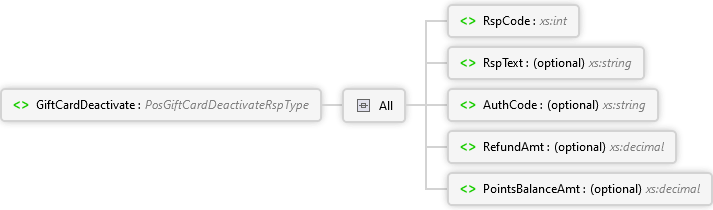 PointsBalanceAmt Element RefundAmt Element AuthCode Element RspText Element RspCode Element All GiftCardDeactivate Element