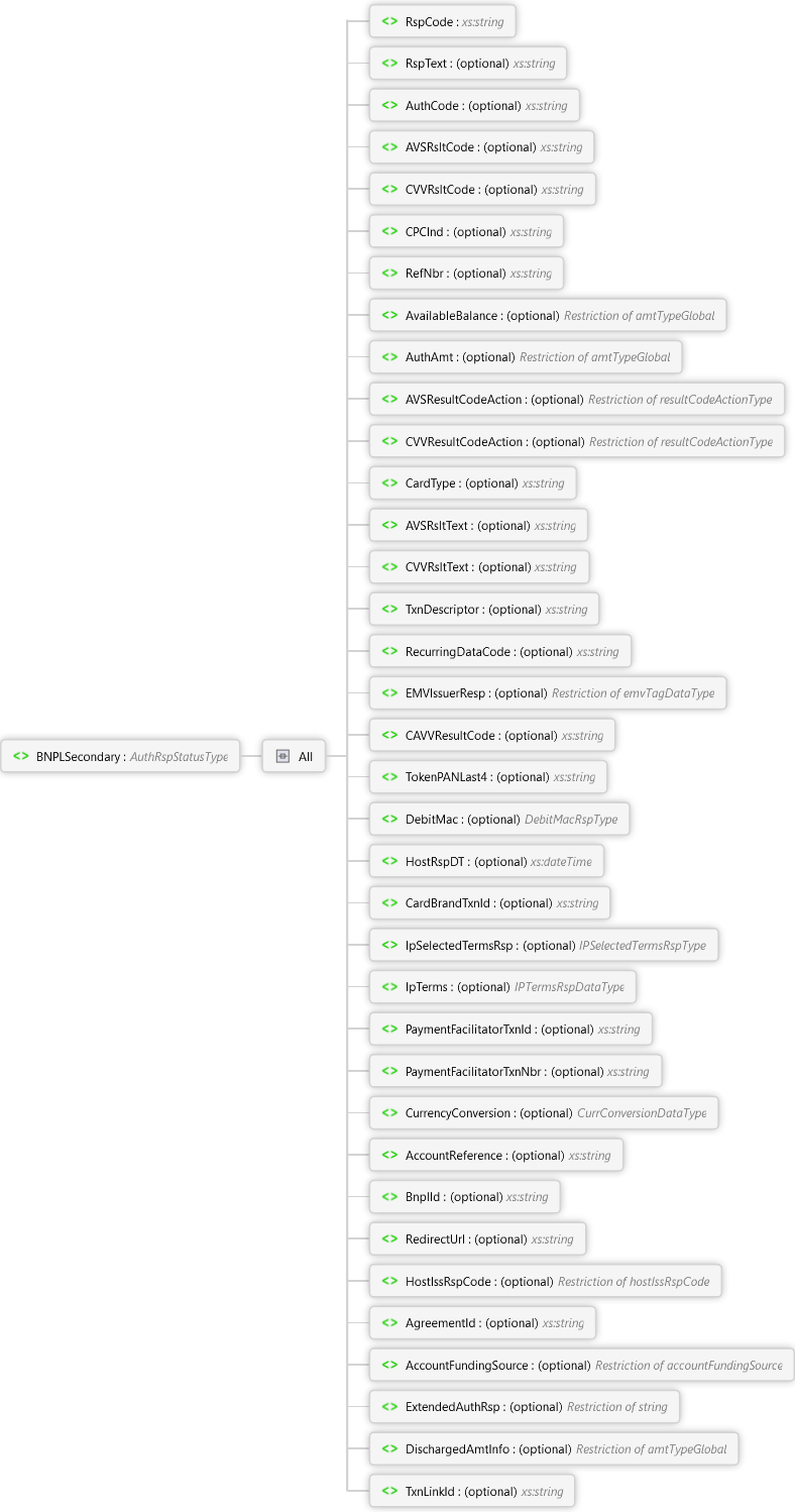 TxnLinkId Element DischargedAmtInfo Element ExtendedAuthRsp Element AccountFundingSource Element AgreementId Element HostIssRspCode Element RedirectUrl Element BnplId Element AccountReference Element CurrencyConversion Element PaymentFacilitatorTxnNbr Element PaymentFacilitatorTxnId Element IpTerms Element IpSelectedTermsRsp Element CardBrandTxnId Element HostRspDT Element DebitMac Element TokenPANLast4 Element CAVVResultCode Element EMVIssuerResp Element RecurringDataCode Element TxnDescriptor Element CVVRsltText Element AVSRsltText Element CardType Element CVVResultCodeAction Element AVSResultCodeAction Element AuthAmt Element AvailableBalance Element RefNbr Element CPCInd Element CVVRsltCode Element AVSRsltCode Element AuthCode Element RspText Element RspCode Element All BNPLSecondary Element
