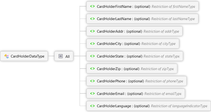 CardHolderLanguage Element CardHolderEmail Element CardHolderPhone Element CardHolderZip Element CardHolderState Element CardHolderCity Element CardHolderAddr Element CardHolderLastName Element CardHolderFirstName Element All CardHolderDataType Complex Type