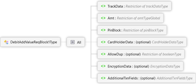 AdditionalTxnFields Element EncryptionData Element AllowDup Element CardHolderData Element PinBlock Element Amt Element TrackData Element All DebitAddValueReqBlock1Type Complex Type