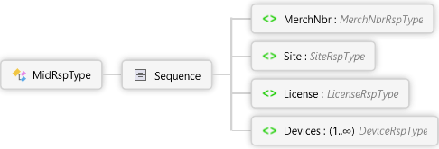<xs:complexType name="MidRspType" xmlns:xs="http://www.w3.org/2001/XMLSchema"> <xs:sequence> <xs:element name="MerchNbr" type="MerchNbrRspType" /> <xs:element name="Site" type="SiteRspType" /> <xs:element name="License" type="LicenseRspType" /> <xs:element name="Devices" type="DeviceRspType" maxOccurs="unbounded" /> </xs:sequence> </xs:complexType>