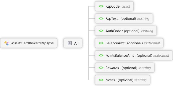 <xs:complexTypename="PosGiftCardRewardRspType"xmlns:xs="http://www.w3.org/2001/XMLSchema"><xs:all><xs:elementname="RspCode"type="xs:int"><xs:annotation><xs:documentation><pxmlns="http://Hps.Exchange.PosGateway">Response (result) code returned by the issuer</p></xs:documentation></xs:annotation></xs:element><xs:elementname="RspText"type="xs:string"minOccurs="0"><xs:annotation><xs:documentation><pxmlns="http://Hps.Exchange.PosGateway">Response (result) text returned by the issuer</p></xs:documentation></xs:annotation></xs:element><xs:elementname="AuthCode"type="xs:string"minOccurs="0"><xs:annotation><xs:documentation><pxmlns="http://Hps.Exchange.PosGateway">If authorized, authorization code returned by the issuer</p></xs:documentation></xs:annotation></xs:element><xs:elementname="BalanceAmt"type="xs:decimal"minOccurs="0"><xs:annotation><xs:documentation><pxmlns="http://Hps.Exchange.PosGateway">Balance on the account after the transaction</p></xs:documentation></xs:annotation></xs:element><xs:elementname="PointsBalanceAmt"type="xs:decimal"minOccurs="0"><xs:annotation><xs:documentation><pxmlns="http://Hps.Exchange.PosGateway">Points balance on the account after the transaction</p></xs:documentation></xs:annotation></xs:element><xs:elementname="Rewards"type="xs:string"minOccurs="0"><xs:annotation><xs:documentation><pxmlns="http://Hps.Exchange.PosGateway">Identifies rewards added to the account as a result of a transaction</p></xs:documentation></xs:annotation></xs:element><xs:elementname="Notes"type="xs:string"minOccurs="0"><xs:annotation><xs:documentation><pxmlns="http://Hps.Exchange.PosGateway">Contains rewards messages to be displayed by the client to inform an account holder about special rewards or promotions available</p></xs:documentation></xs:annotation></xs:element></xs:all></xs:complexType>